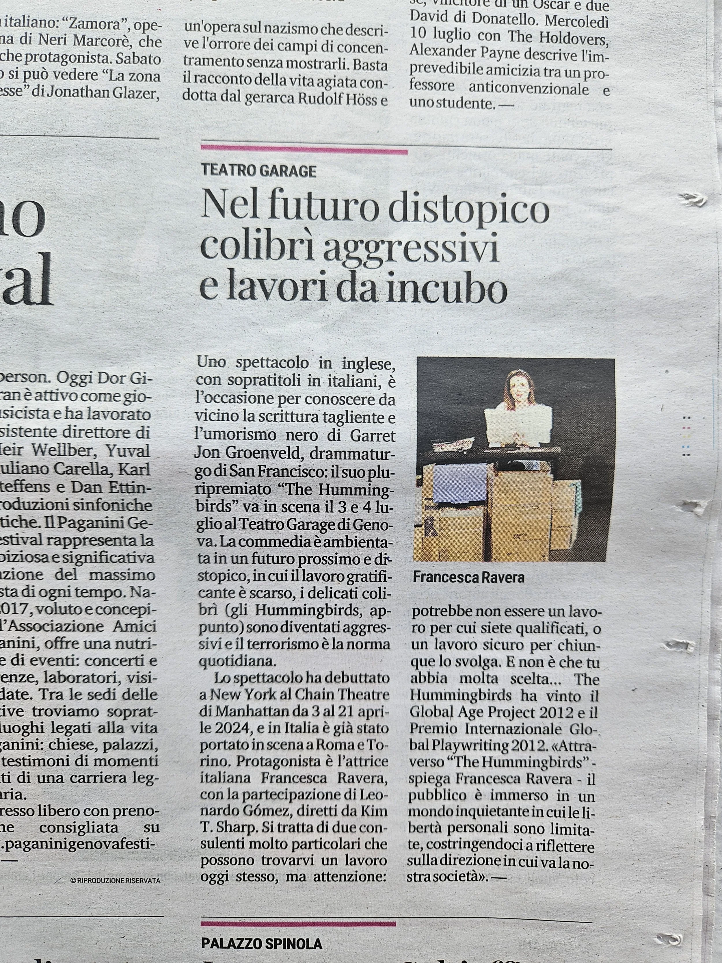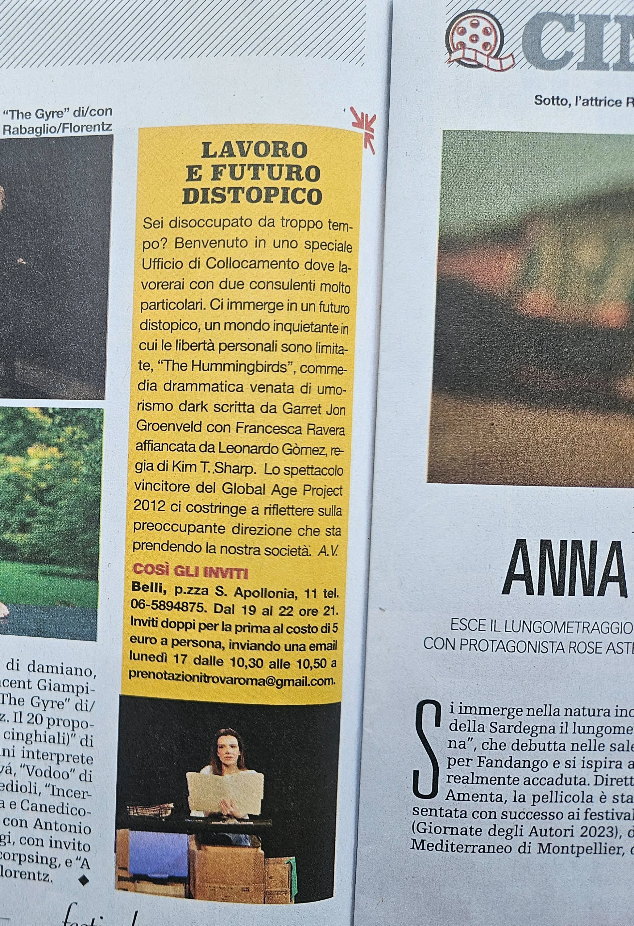 Here, the production is entirely American: it debuted last April at the Chain Theatre in Manhattan. The Hummingbirds won the Global Age Project 2012, the Global Playwriting International Award 2012, and debuted in 2022 at New Jersey Rep. It has toured many parts of Europe, and the next stop will be northern Italy.”